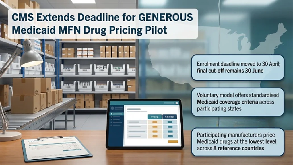 The Centers for Medicare & Medicaid Services (CMS) in the US has moved to extend the enrolment window for its GENEROUS pilot programme, an initiative aimed at introducing most-favoured-nation (MFN) pricing for outpatient drugs reimbursed by Medicaid. The agency has revised the participation deadline, shifting it from the end of this month to 30th April. The change has prompted speculation that CMS may be encountering difficulty in securing sufficient interest from companies willing to join the model.
