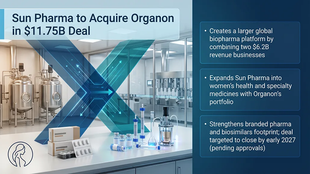 Sun Pharmaceutical Industries has agreed to acquire Organon in a transaction valued at $11.75 billion, creating what the company described as the largest Biopharma Deal recorded in 2026. The agreement brings together two businesses that each generated $6.2 billion in revenue in 2025, effectively doubling Sun Pharma’s scale and strengthening its global position. Already India’s leading biopharma company, Sun Pharma will significantly expand its presence in women’s health and specialty medicines through the addition of Organon’s portfolio. The transaction is expected to close by early 2027, subject to regulatory approvals and customary conditions.
