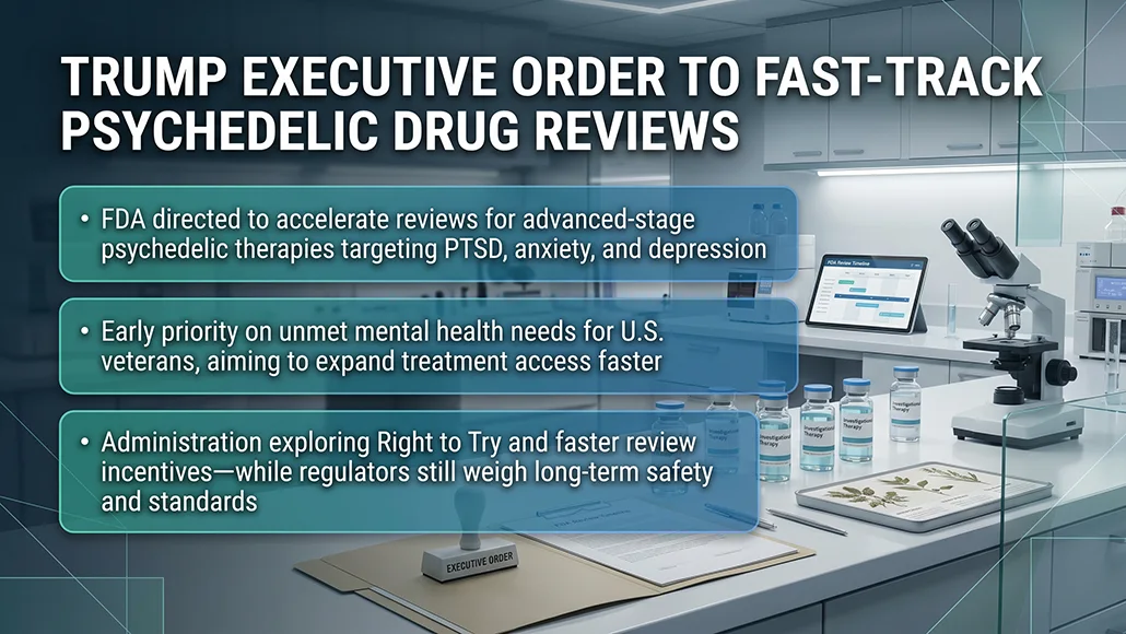 The Trump administration has introduced a new executive order designed to accelerate Psychedelic Drug Reviews, marking a notable policy move aimed at expediting regulatory pathways for emerging mental health treatments. The directive focuses on advancing FDA evaluation processes for investigational psychedelic therapies, particularly those addressing conditions such as post-traumatic stress disorder (PTSD), anxiety, and depression. The initiative reflects a broader shift in regulatory priorities, with an emphasis on improving access to innovative treatment options for patients facing limited alternatives.